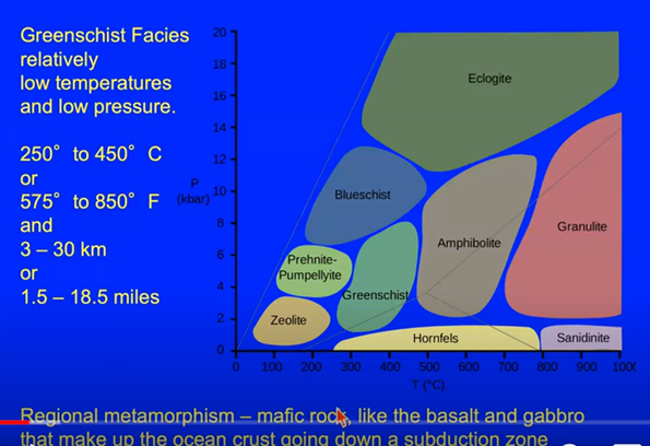In the chart above, we can see that greenschist, which is mafic in nature (i.e., high in magnesium and ferric oxides), formed when the pressure (vertical axis) was relatively low to medium and the temperature (horizontal axis) was relatively low. The low to medium pressure, Debra noted, is consistent with why the actinolite is found relatively close to the surface, making it available for collectors on the mudflats which is the second theme of her presentation.