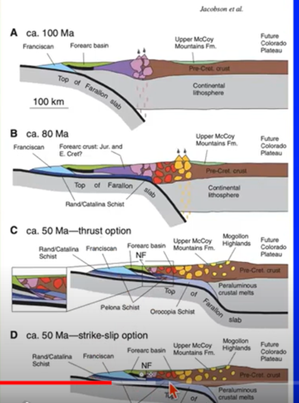 Fast forward from 100 million years ago, Figure A below, to about 50 million years ago, Figure D, through the description of possible plate subduction phases. Notice the tiny red arrow at the very bottom of Figure D. That, Debra said, is where the overburden has eroded, exposing the layer of rock which contains the actinolite that is found today.