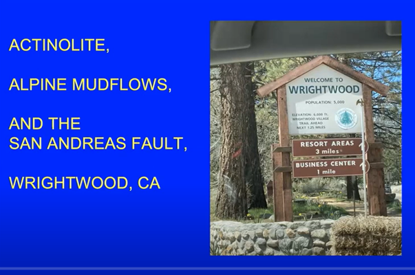 “This is a talk about actinolite, a mineral that is easy to collect in my part of the world . . . because of what they colloquially call ‘alpine mud flows,’ a type of landslide, and because (the flows) take place near the town of Wrightwood, CA which sits atop the San Andreas Fault.”