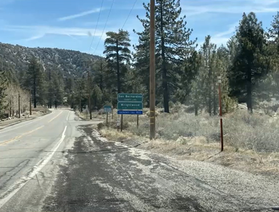 The small town of Wrightwood, California is in San Bernardino County and is bordered by Route 2 on the east, the Mountain High East Yetis Snow Park on the north, and Blue Ridge Mount on the south. The town site is designated below by the tiny red line and circle on the far left of the map below. The grey areas are the populated regions of the County. The white areas in between the grey is the geographic area where the crustal accumulation of broken rock and actinolite are found today.