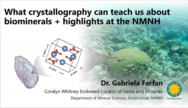 Dr. Gabriela Farfan, the Carolyn Whitney Endowed Curator of Gems and Minerals, described her MSDC Zoom presentation as having two parts: the crystallography of biominerals and recent gem acquisitions at the Smithsonian.