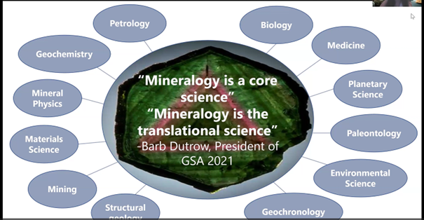 Gabriela shared her vision of the role mineralogy plays in today’s world by citing geology professor Dr. Barb Dutrow’s GSA presidential address (2021) in which she said in effect: a lot of people see mineralogy as a science that is no longer relevant, when, in reality, minerals are the basic building blocks that construct our solid earth.