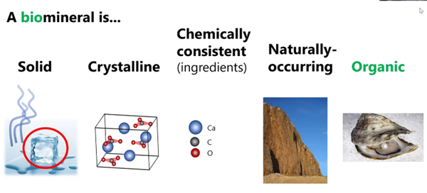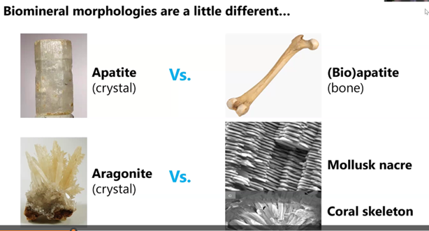 Often times biominerals such as apatite and aragonite shown below in the right-hand column look physically different from their inorganic counterparts in the left column.