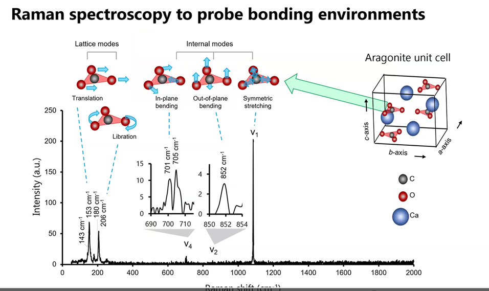 Her research extended further to explore the contrast between the thin green and larger blue aragonite structures. The data obtained from the Raman photon bombardment of the blue crystal (below) suggested to Gabriela there may be important structural differences between the pearl’s green and blue crystals. To discover how the scattering of the light and changing energy levels created a “dance” of the oxygen atoms and how that suggested the manganese was incorporated into the pearl during the Fall season, go directly to the 68-minute mark of her YouTube video.