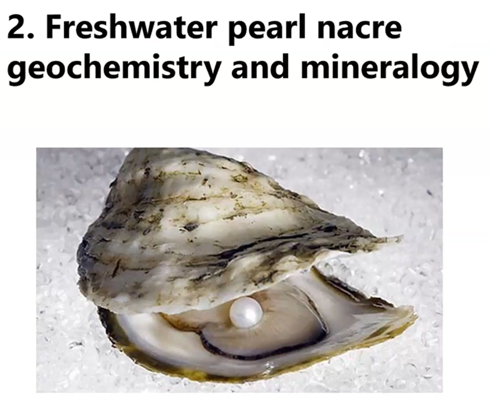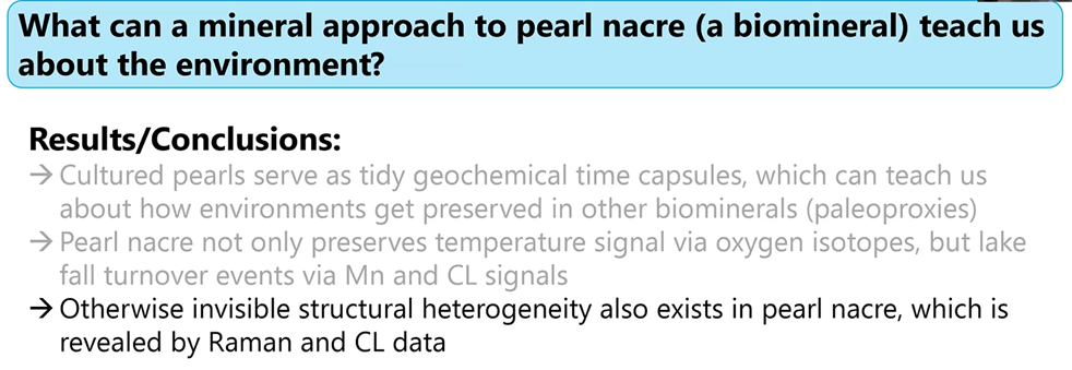 Gabriela noted: Look at how much more we can learn by combining these tools that typically have not been extensively used in the study of mineralogy. She then highlighted some conclusions to her mineralogical research with what pearl nacre can teach us about the environment.