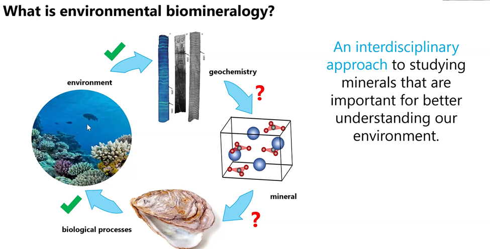 Gabriela described environmental biomineralology as having four dimensions, only two of which have been studied to date. As shown below, “environment” and the “biological processes” have the green check mark indicating they have been studied. But the “interdisciplinary geochemistry” and the “minerals” themselves, on the right-hand side of the illustration, with the red question marks, are frontiers that need to be explored.