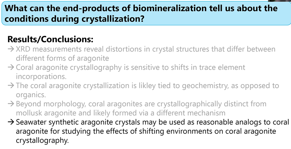 Gabriela concluded this first part of her presentation, coral aragonite crystal structures, with the following summary: