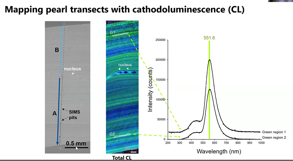 Also, with the help of the Carnegie Foundation, Gabriela was able to explore and find that photoluminescence revealed a trove of new information about the structure of the pearl. She discovered for example that cathodoluminescence highlighted previously unknown traces of elements such as manganese, which appeared as a faint green light in the second column shown below.