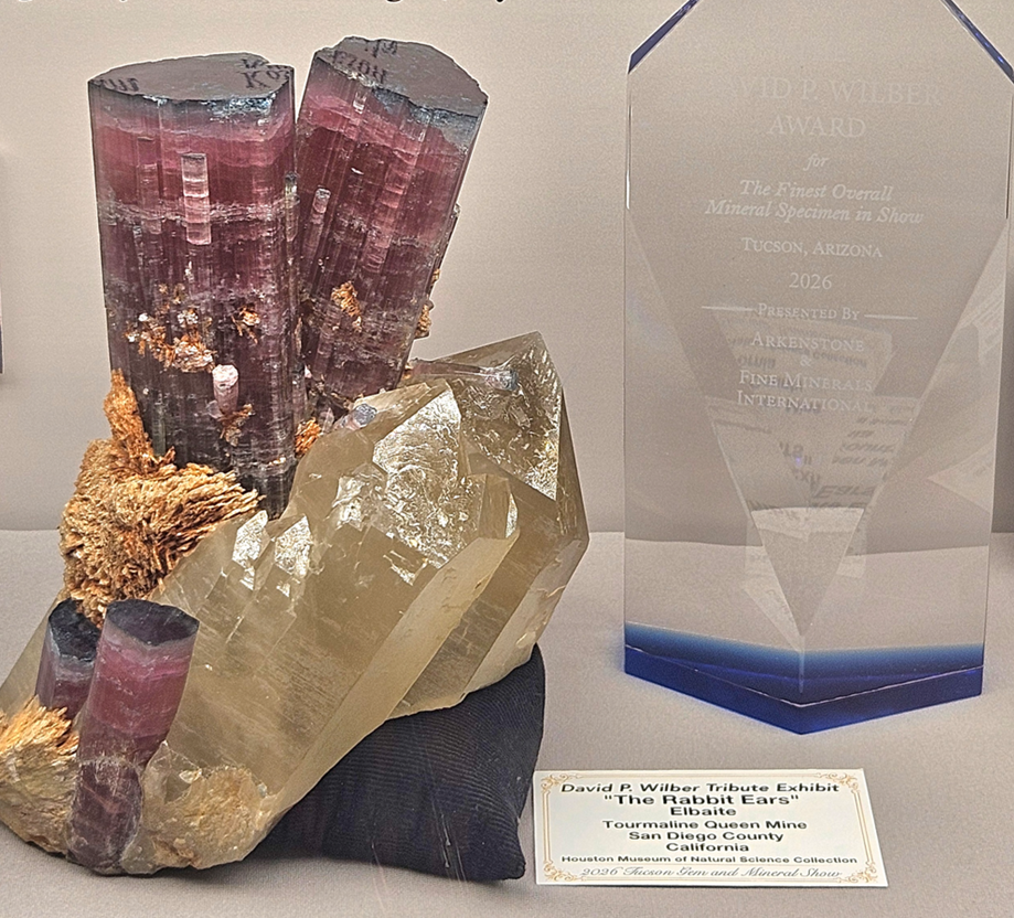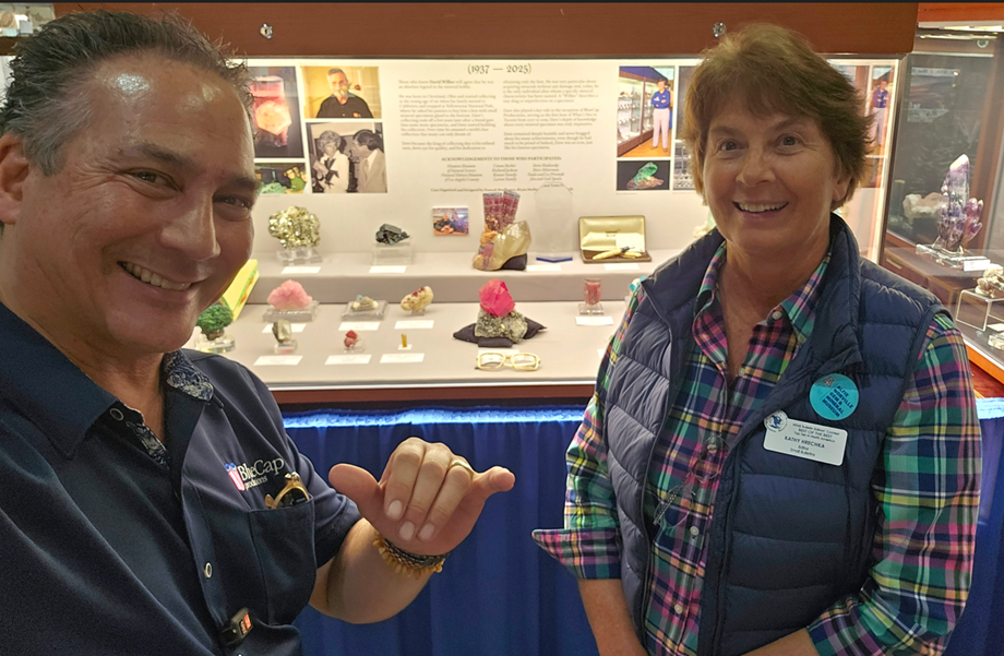 Brian Swoboda of Blue Cap Productions, Honolulu, Hawaii & Kathy Hrechka, Alexandria, Virginia were admiring a great exhibit, a tribute to David P. Wilber 1937-2025. The elbaite in the background won “The Finest Overall Mineral Specimen in the Show”. The trophy was sponsored by Arkenstone and Fine Minerals International. Selfie by Brian Swoboda.