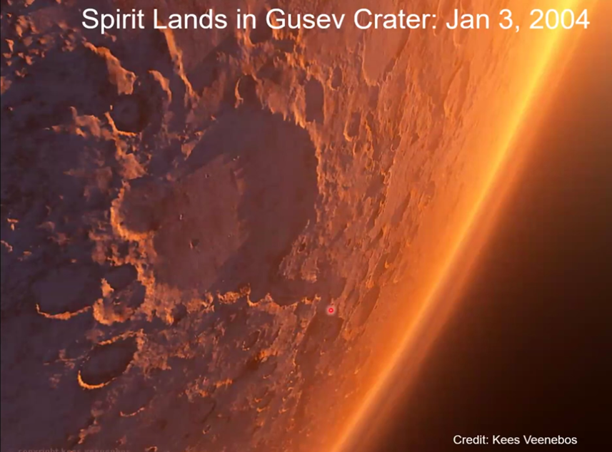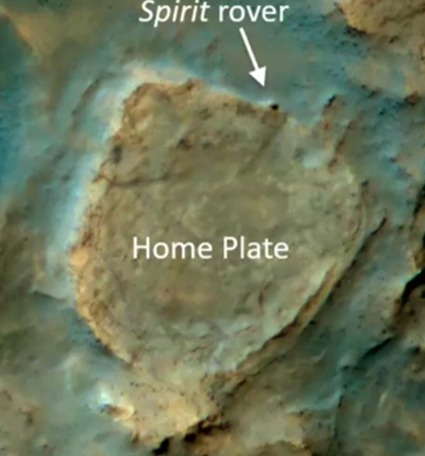 Despite having passed the anticipated three-month life of the mission, Spirit continued to generate solar energy. This was thanks to windstorms that cleared the rover’s solar panels of dirt. So the teams directed the rover to travel outside the crater to a second site, Home Plate. The camera on the orbiter circling Mars captured a photo of Spirit as it arrived at the northern edge of Home Plate as shown below.