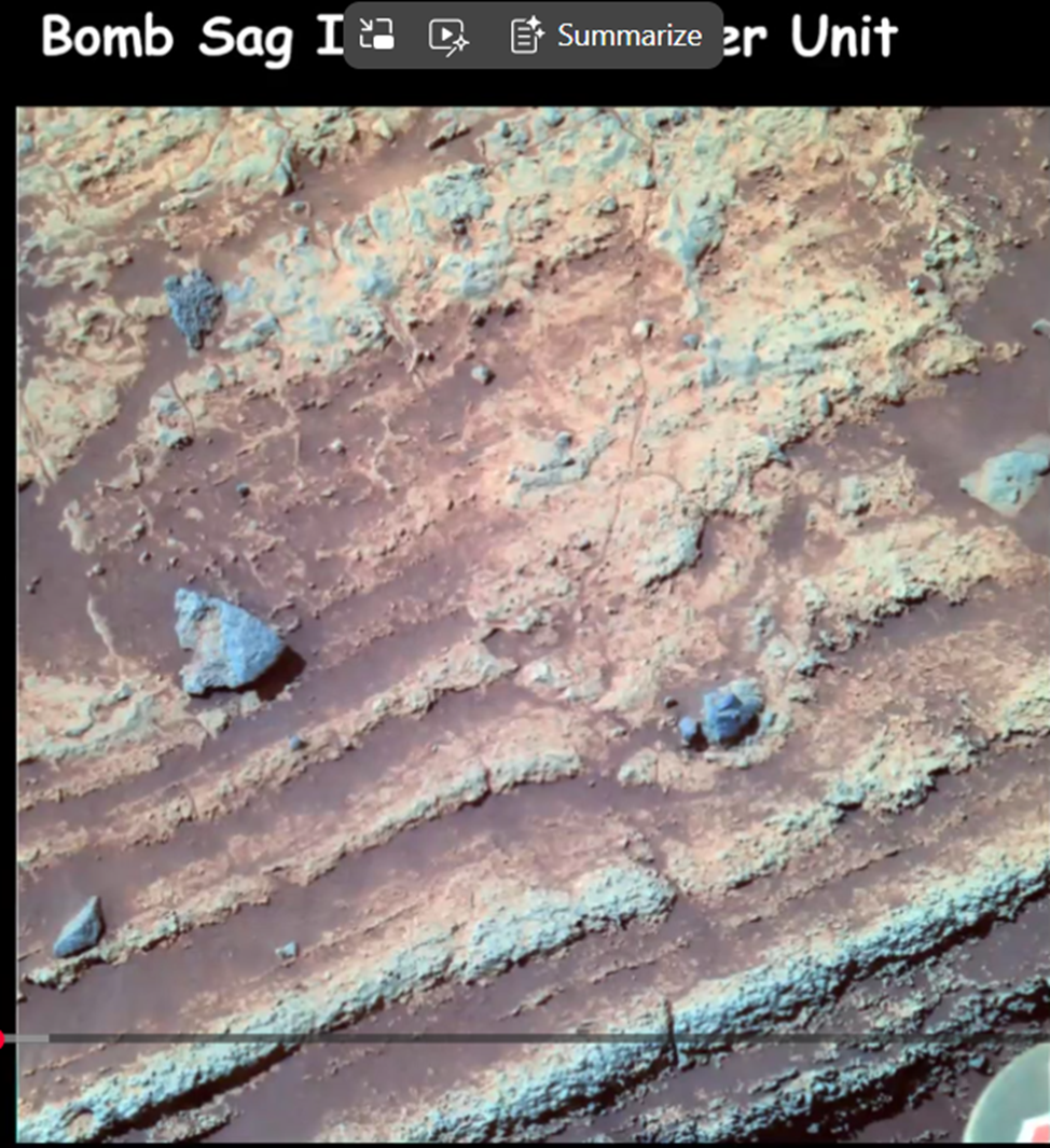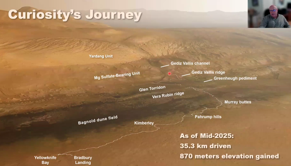 Curiosity’s path is charted as shown above by the thin white line which moved from the lower left near the landing site, Bradbury Landing, up to the middle, Gediz Vallis ridge, about two or three years ago. At the time of John’s presentation (February 4, 2026), Curiosity was farther up the Gediz Vallis channel and so far has traveled about 38 kilometers and 900 meters in elevation.