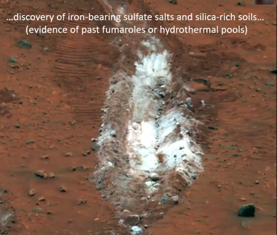 John also explained how the accidental discovery of iron-bearing sulfate salts and silica-rich soils pictured below, provided important additional evidence of a wetter, early Martian landscape. The discovery occurred when one of Spirit’s wheels became stuck and the rover was driven backwards and dragged over the terrain. This dragging motion crushed a rock and exposed its interior minerals that provided inferential evidence of water.