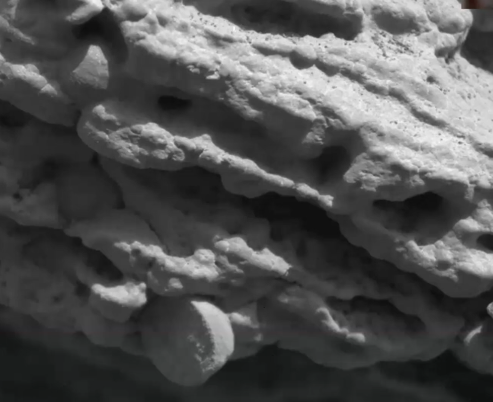 The following photo taken by Perseverance, at higher elevations, shows short, cigar-shaped features, many broken-up segments three to five centimeters in length. They constituted ripple formations, consistent with the oscillation of waves of water.