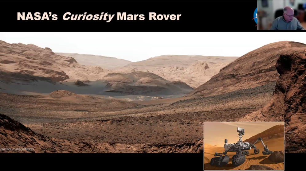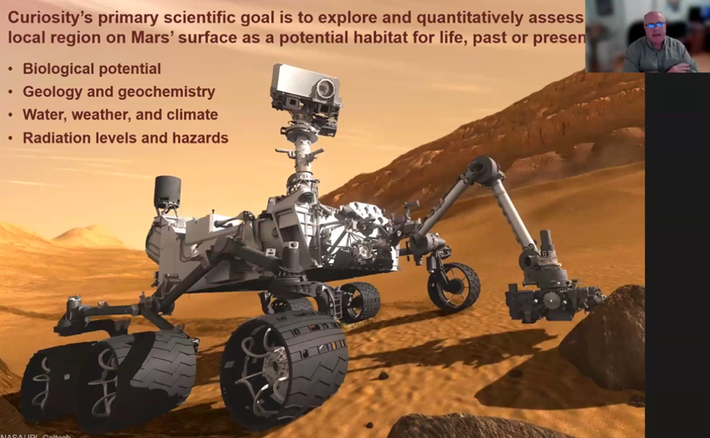 Although more discoveries were made, eventually Opportunity was caught in an extended sandstorm which blocked sunlight sufficiently to shut down its solar battery. Earlier in 2009, Spirit earlier had become trapped in a small crater. It continued in 2010 to function as a stationary transmitter and its mission was declared completed in 2011. So later, with Opportunity’s demise in 2019, that ended the second of the two MER missions, MER-A Spirit and Opportunity, MER-B. Having explained the highlights of the two earlier rovers' missions, John then spoke about the Curiosity rover's mission.