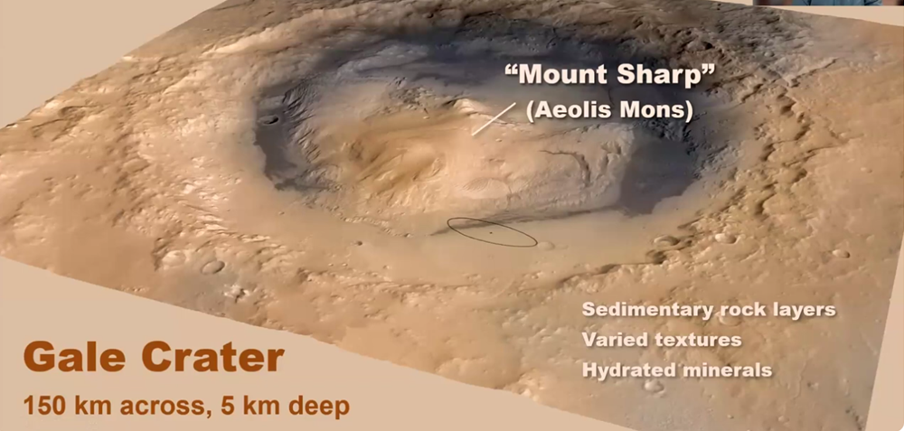 Curiosity landed in Gale Crater in 2012 and has spent the last 13 years, including into early 2026, exploring Mount Sharp. The elliptical image below shows the landing site. The dark line at the bottom of Mount Sharp crosses the landing site ellipse, extends to the right, and indicates the lowest elevation of Mount Sharp.