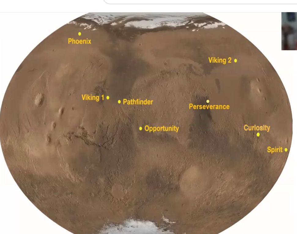 To date there have been eight missions to Mars whose landing locations and exploration sites are identified on the map that John provided (below). The three on which he primarily worked, Spirit, Opportunity, and Curiosity, are on the right side of the map. Perseverance, the fourth and newest mission, is currently operating in the region between those earlier three landing sites.