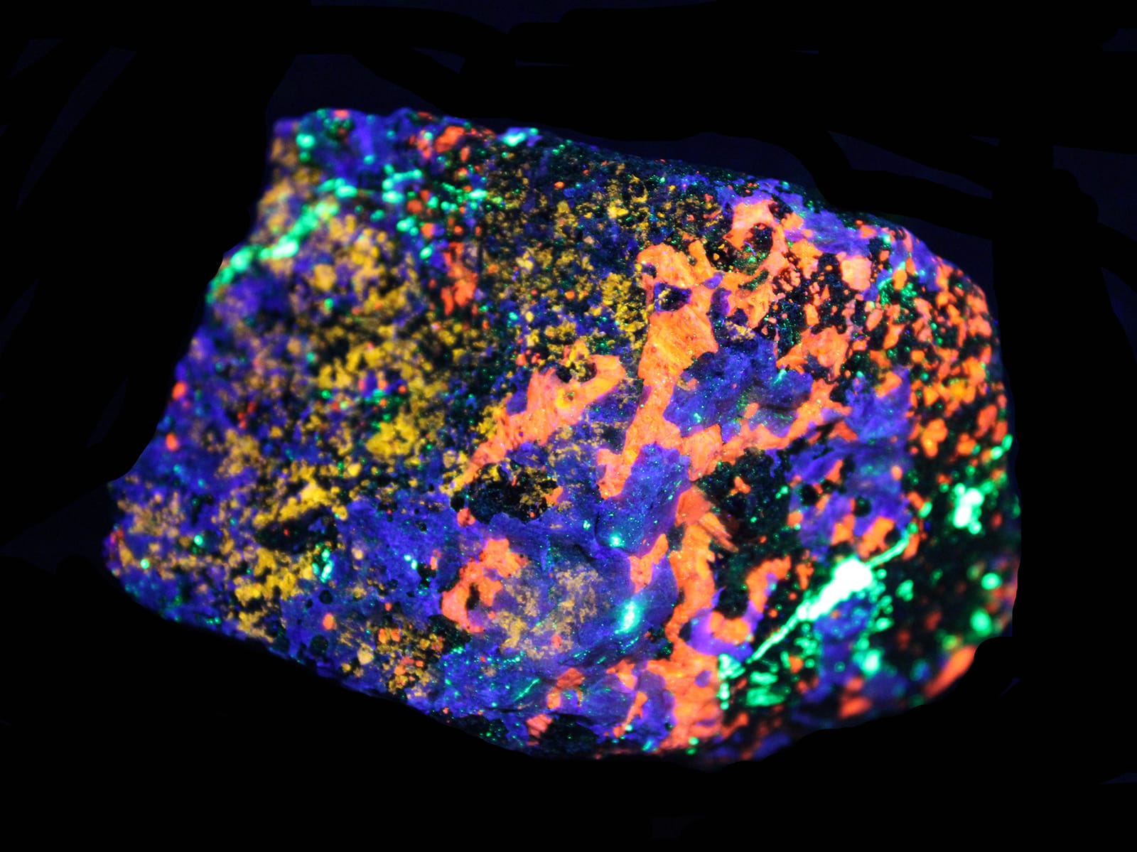 Jim said that could be the topic of his next 45-minute presentation. But his short answer was that fluorescence is a change in the frequency of the UV light that was initially directed into the minerals and then bounces back out at a different wavelength (and color). Jeff added that the incoming UV light strikes the minerals’ electrons, knocking them into a higher energy electron orbit which results in their emitting energy as a change of color as the electrons drop back toward their original orbit. Jim appreciated Jeff’s explanation.