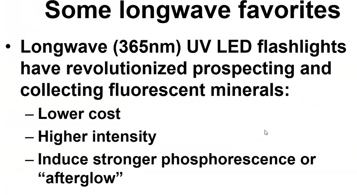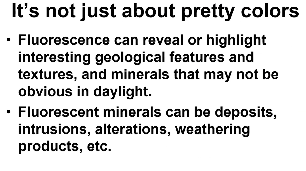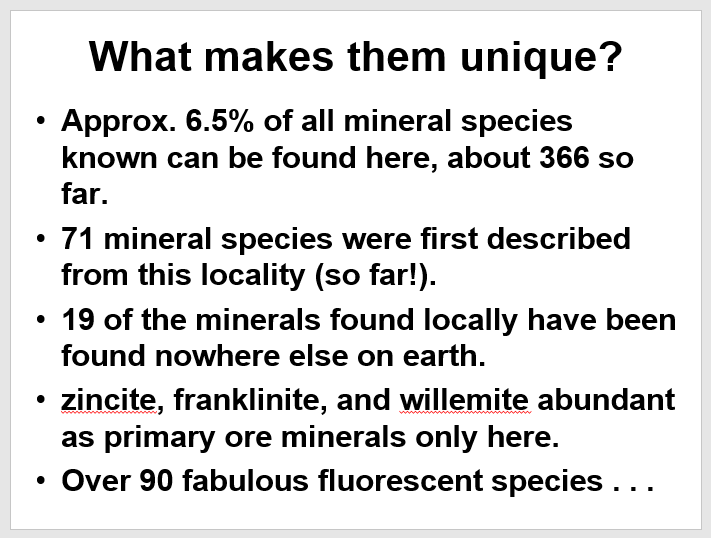 The primary focus on Jim’s presentation, the fascinating nature of the two mines’ fluorescent minerals, he attributed to the uniqueness of their minerals, summarized in the following slide.