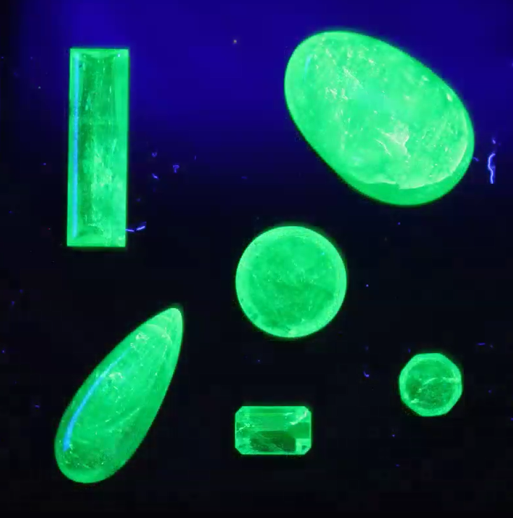 But the cabbed and facetted gems then fluoresce beautifully when hit with UV light.