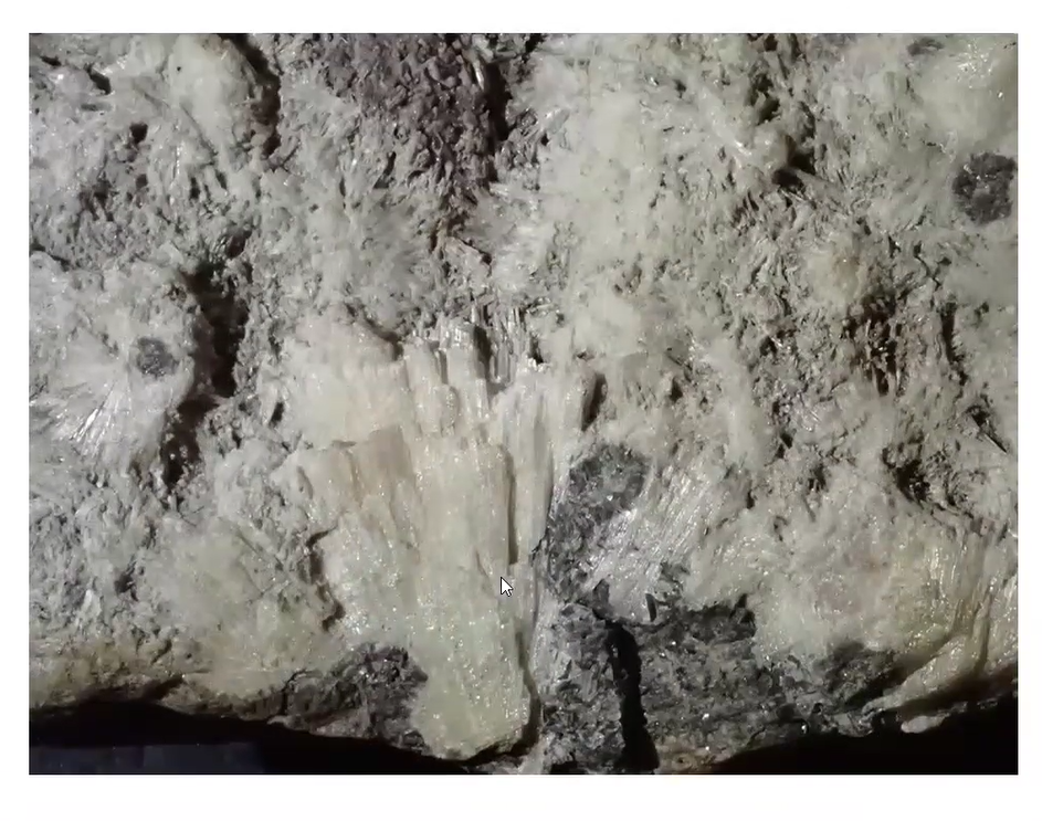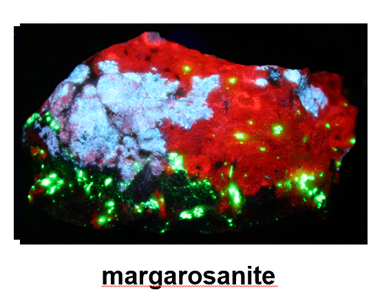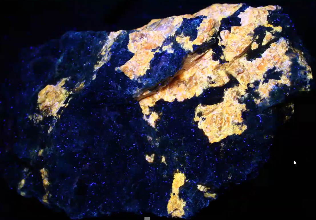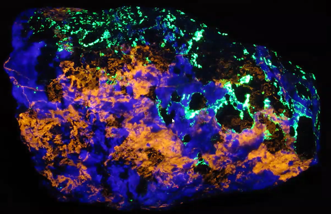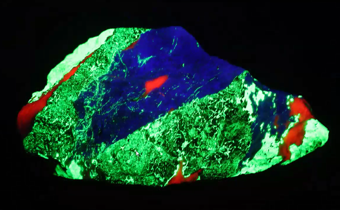 “There’s some interesting geology going on beyond the fluorescence” Jim noted, in reference to a clinohedrite specimen shown below. This is when interested readers will definitely need to view the YouTube video of Jim’s explanation in which his cursor points out the behavior of the diverse minerals and what brought them to be where they came to rest in the specimen.