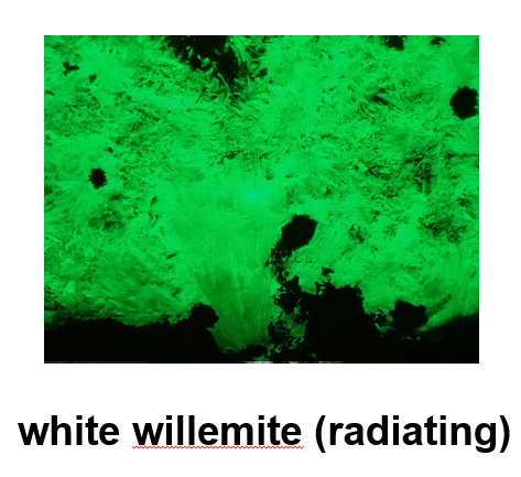 Jim showed examples of willemite with small inclusions of red zincite and black franklinite, as well as variations of willemite with mineral inclusions of many colors (e.g., light green, mint, purple grape, yellow, brick red, tan, pink, dark brown, gray, and black), all of which fluoresce green. Of all of these, Jim noted, “I think Ken Reynold's favorite is the white willemite with acyclic needle-like radiating willemite crystals that fluoresce brilliantly. And, they also phosphoresce.”