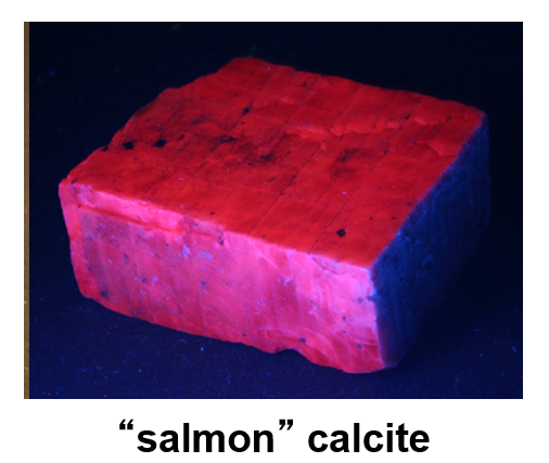 Jim then moved on to other minerals found at the two mining areas. Jim noted that “calcite is the most common skarn mineral in Franklin and Sterling Hill sites.” Below, for example, is a salmon calcite as it appears in sunlight and then under UV light.