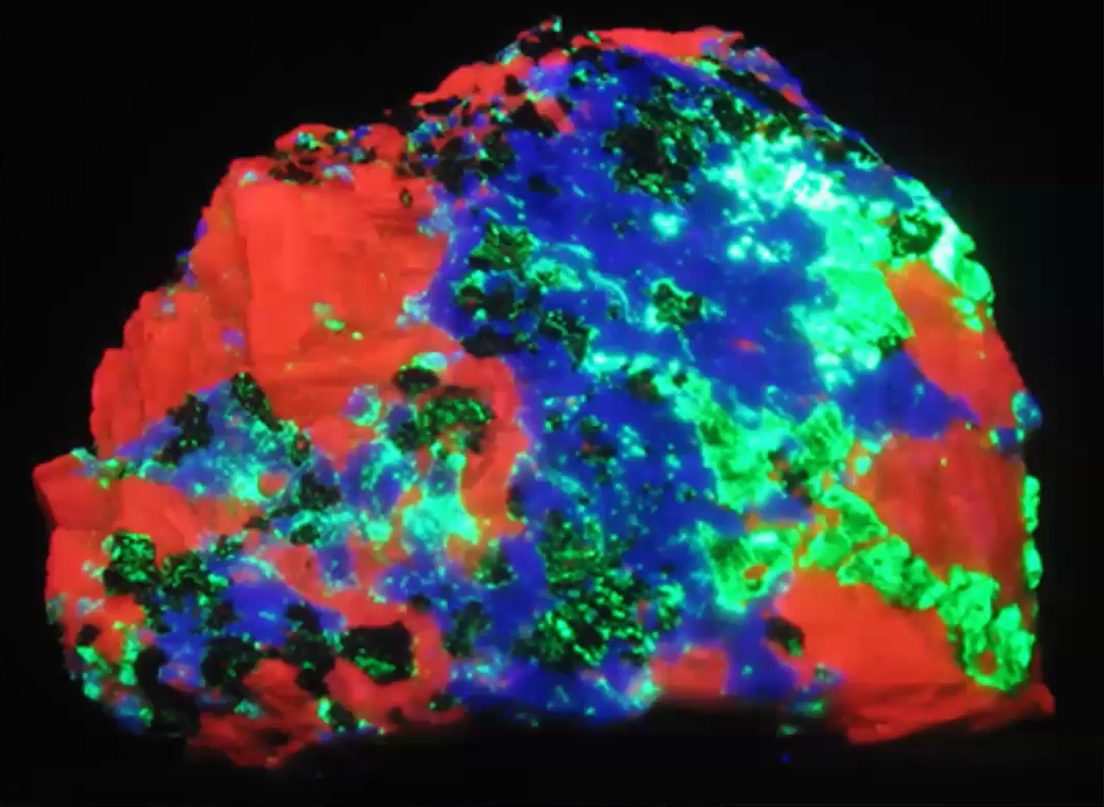 Below is “Crazy Calcite” from Franklin which is a combination of calcite and dolomite, before and after UV light. The tiny black specks are Franklinite, also known as “pepper.”