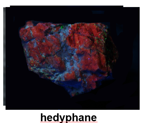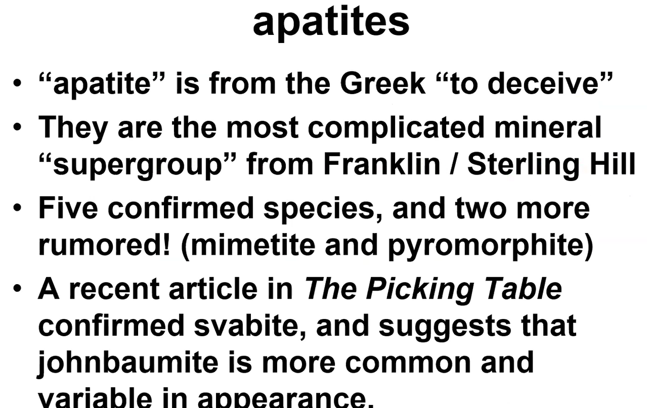 After showing many additional specimens of willemite interacting with other minerals, Jim introduced another type of a fluorescent mineral group, the apatites, which has at least five confirmed species.