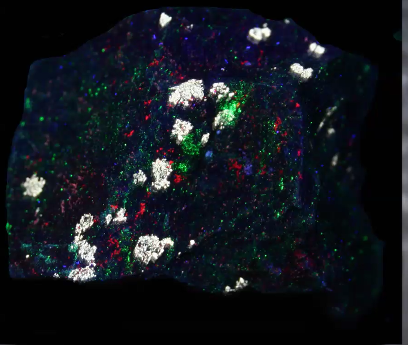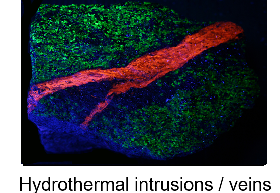 And below is a more common event where the longwave UV fluorescence shows a heated hydrothermal sphalerite fluid (red) had intruded into the host rock (green) and quenched the fluorescence on either side (dark blue) of the intrusion zone.