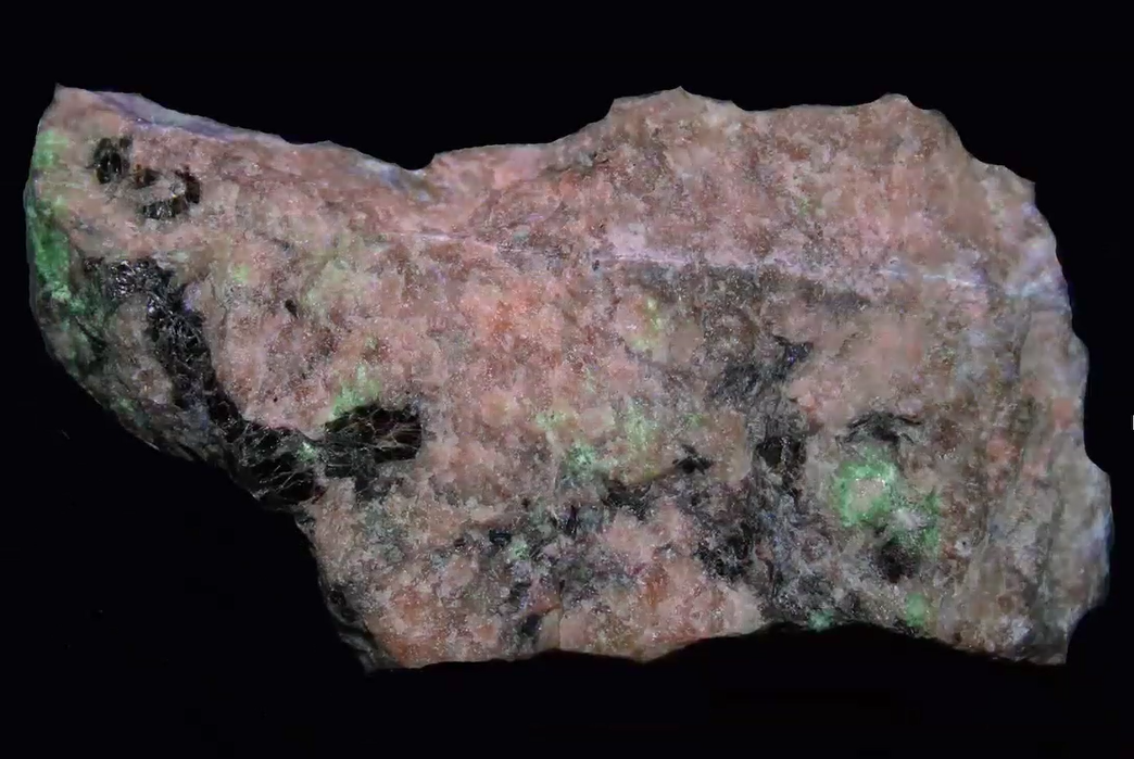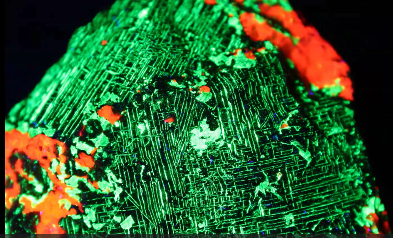 Using another hardystonite specimen below, Jim explained how during the process of these rocks’ formation, the tephroite and willemite interaction is such that “the tephroite (appearing to fluoresce green) can’t accept the zinc silicate and so the willemite is literally squeezed out (exsolved) and forms little dots or lines.”
