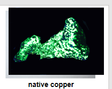 Jim showed another dozen or so minerals and noted that sometimes tiny specks of willemite dust are pervasive. So a specimen can appear to be fluorescing but it is not actually doing so. Below is a case in point. The native copper appears to fluoresce but it is only the willemite dust on the surface that is fluorescing.