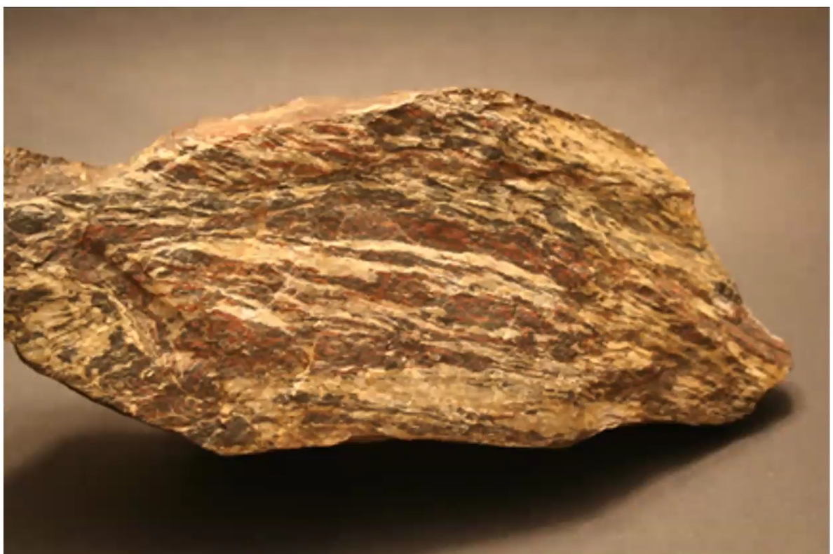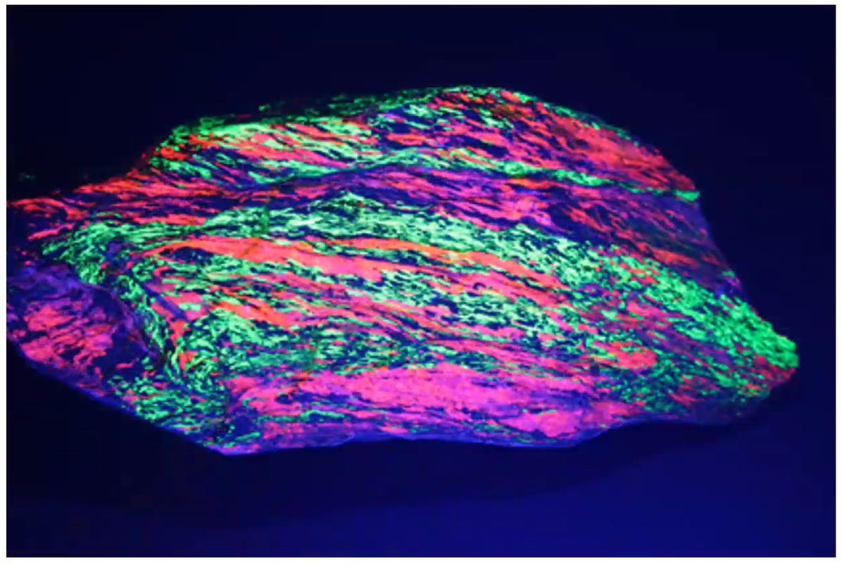 Fluorescent minerals sometimes can show evidence of their earlier formation and alterations, and Jim presented the Sterling Hill mylonite specimen below as an example. It shows signs that it had been flattened and stretched by faulting which occurred throughout the wider terrain where it was found.