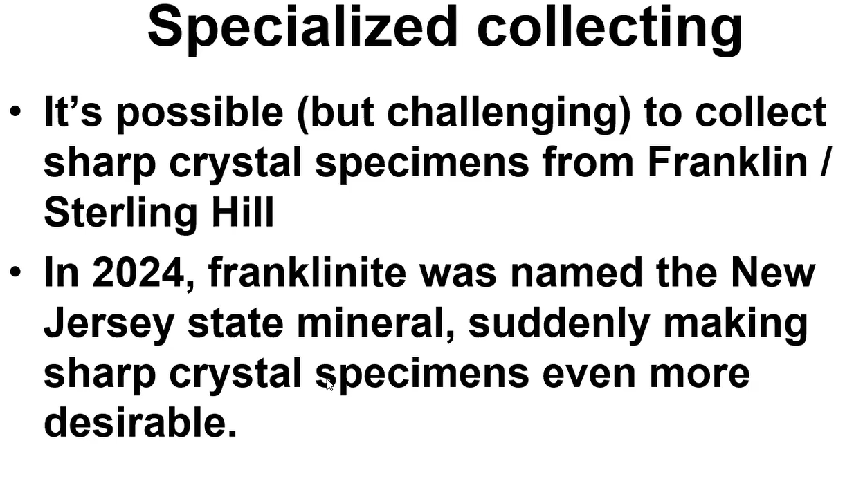 Readers: The purpose of this report is to give those who missed it an overview and to encourage everyone to watch the video of his excellent presentation. Here is the link: Collecting Franklin Fluorescent Minerals – James Van Fleet (52 minutes).