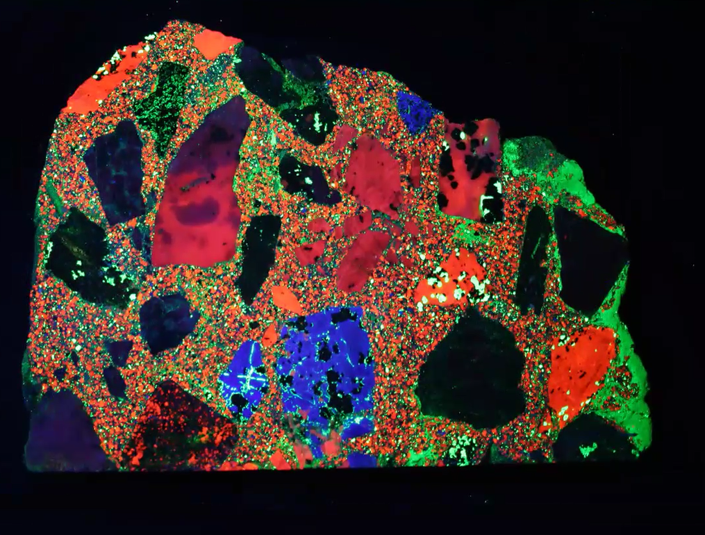 Those mining artifacts range from zinc ingots below to beautiful multicolored concrete composed of rock chip aggregate. And, collectors also look for art work, drill core samples, processed ore, speleothems, and lapidary, all of which fluoresce under UV light as shown in the multicolored concrete below.