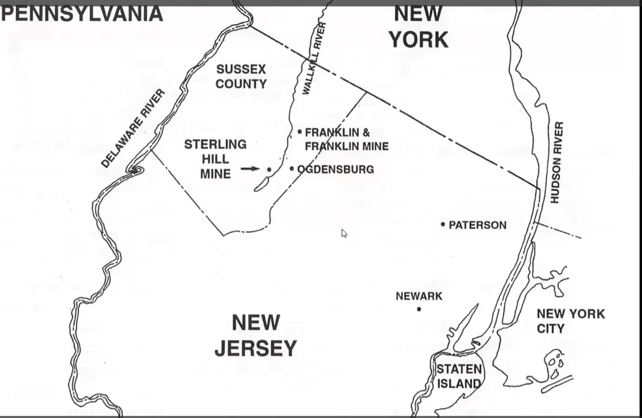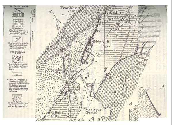 Jim shared the illustration below showing the very diverse geological formations surrounding the mines. It includes Paleozoic dikes of the post-Ordovician era, the Ordovician Kittatinny blue limestone, Cambrian hardyston quartzite, Precambrian pegmatite and Franklin limestone.