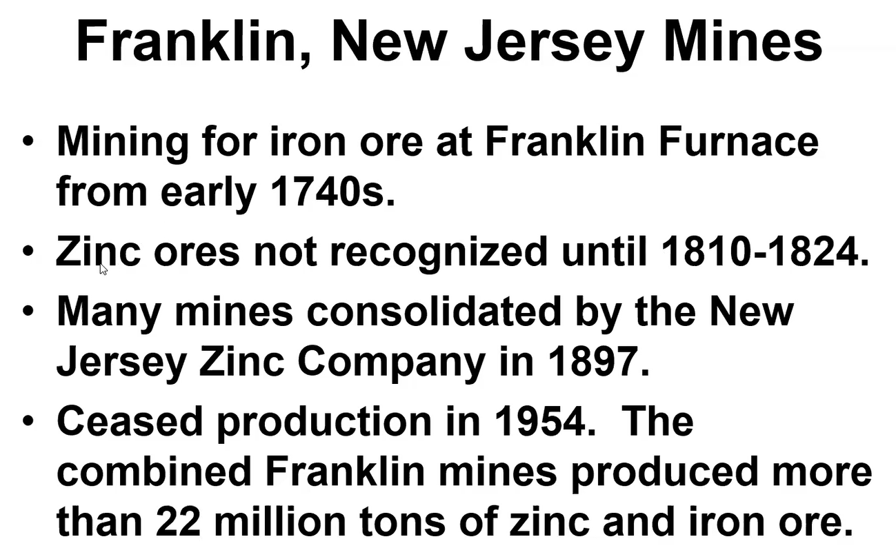 These two mines are the only sites in the world where zincite, franklinite, and willemite are the primary ore minerals. That is what draws mineral collectors to these sites to dig for specimens in the tailings.