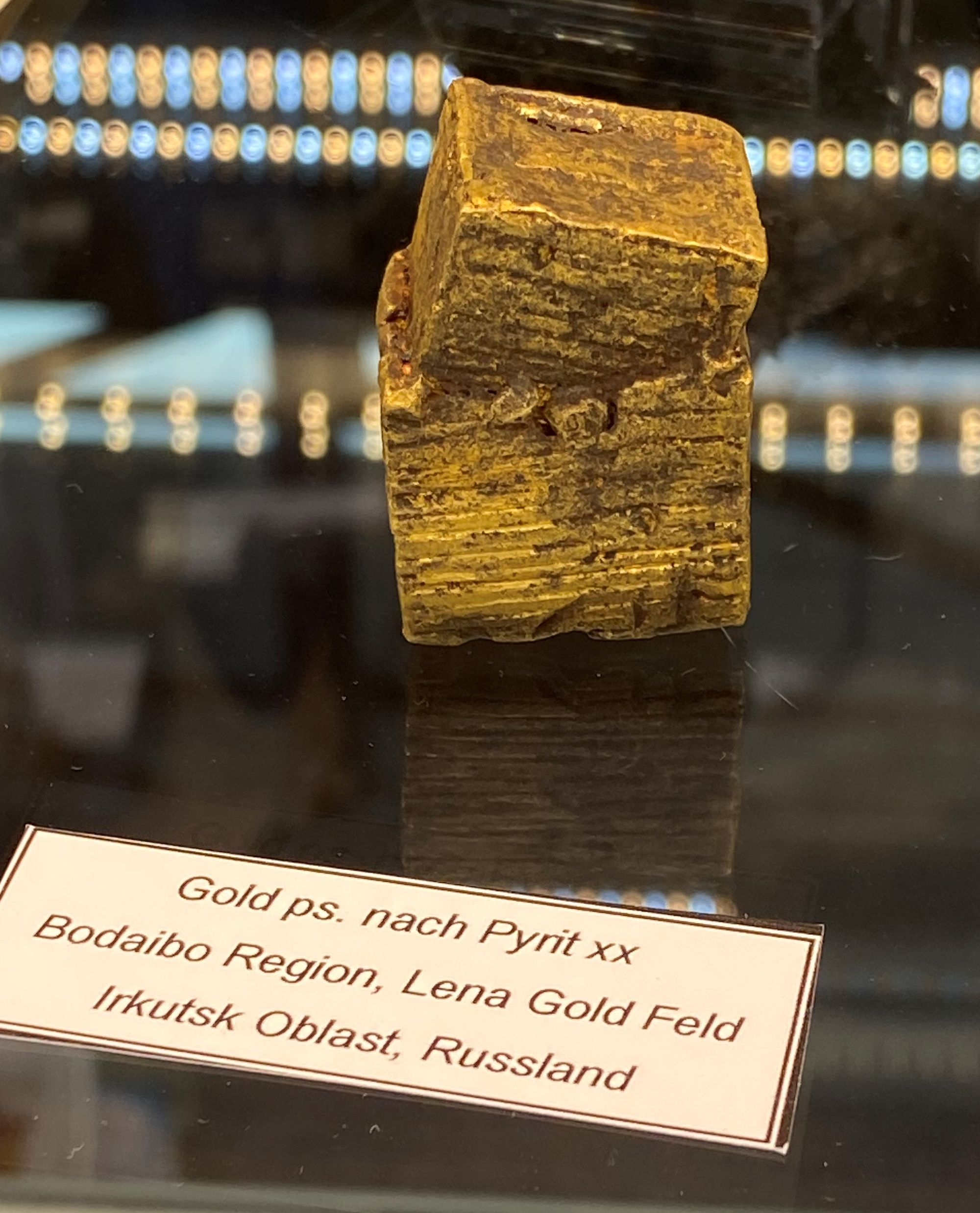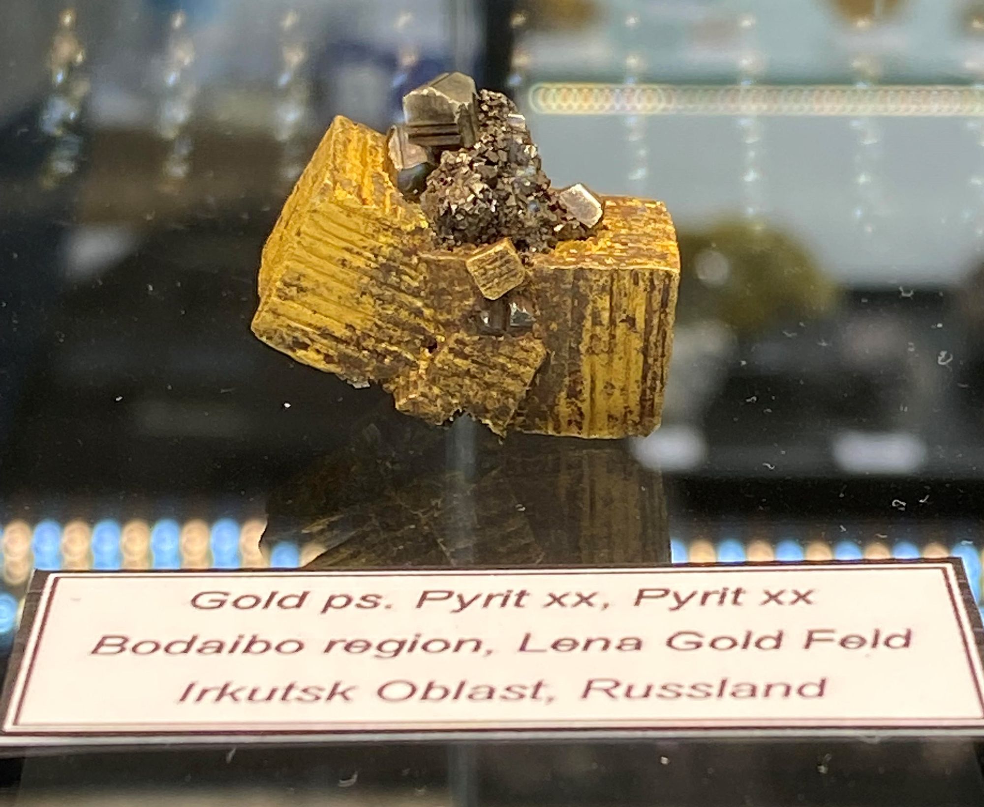 This writeup summarizes key aspects of that technical article and discusses the geology of the Lena goldfield deposits, some of the interesting history of this Russian occurrence, and perhaps most interesting, some of the testing that was done to evaluate whether these specimens are naturally created or if they were created by humans. In particular, the article looks at two distinct types of gold specimens: gold cubes with coarse striations (such as the ones shown in the photo above) and hoppered octahedral crystals (not on display at the show, but included in the article, along with some fabulous photographs).
