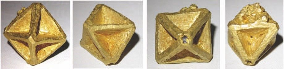 The second type of gold crystals studied is that of hoppered octahedra. The gold octahedra are often in aggregates and commonly associated with quartz. The octahedral crystals studied in the article are unusual in their highly symmetric development and the uniformity of the hoppered surfaces. To test the authenticity of a large single crystal of gold, one of the hoppered octahedra crystals was tested by neutron diffraction at the Los Alamos Neutron Science Center and Los Alamos National Laboratory, New Mexico.
