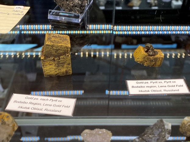 The two gold specimens in the above photo below are quite remarkable. Unlike most gold specimens that typically are found as nuggets, usually with signs of abrasive polishing by streams, or in quartz veins, these pieces were described as pseudomorphs on the labels. What a surprise – at least for me!