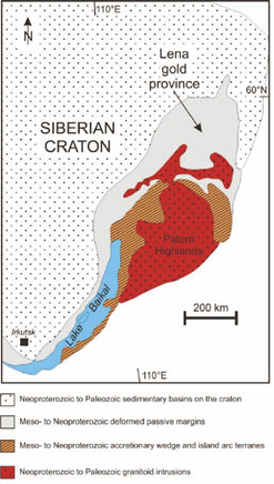 Mining for gold in the Bodaibo area, also referred to as the Lena Goldfields, dates back to the 19th century when gold as first produced from placer deposits. The area consists of a succession of clastic carbonate sediments that are metamorphosed to greenschist and amphibolite facies and are intruded by granites of mid-Paleozoic age. The gold deposits are located in the southeastern margin of the Siberian Craton.