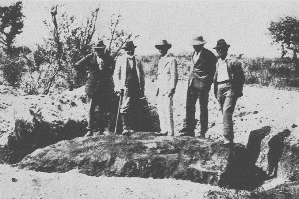"One winter as I was hunting at the farm Hoba I noticed a strange rock. I sat down on it. Only its upper part was visible. The rock was black, and all around it was calcareous soil. I scratched the rock with my knife and saw there was a shine beneath the surface. I then chiselled off a piece and took it to the SWA Maatskappy in Grootfontein, whose director established it to be a meteorite."