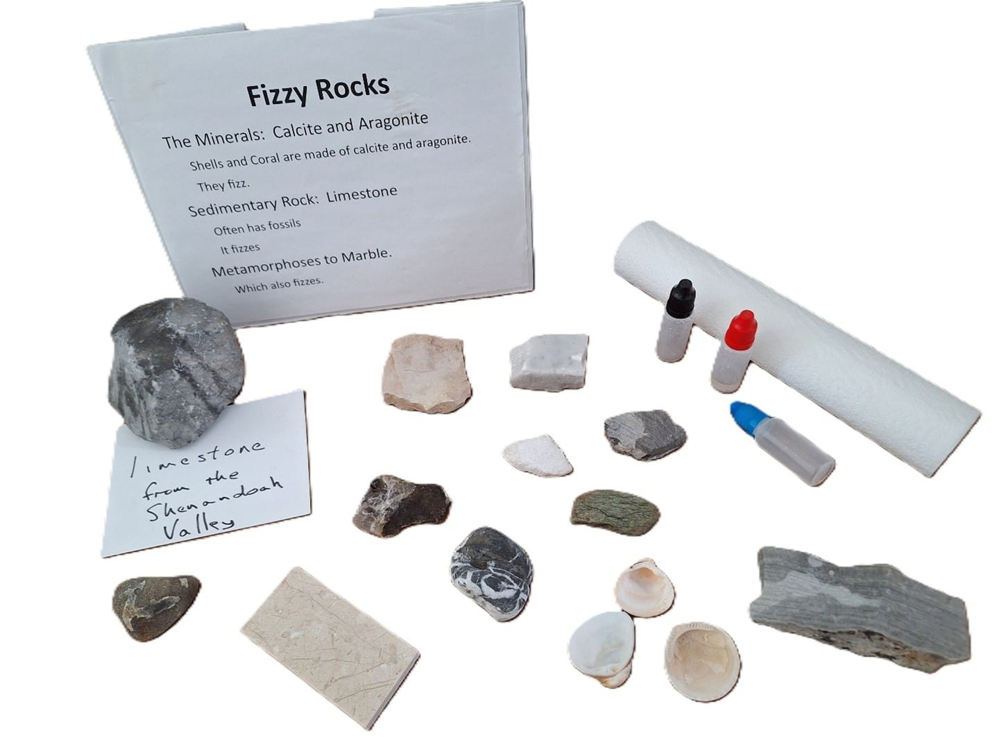 Last month, I described two of our exhibits: the Fossil Match Sorting Challenge and the Shark Coprolite Question. This month, it’s the kids’ favorite exhibit: Fizzy Rocks. I also describe a rookie mistake I made.