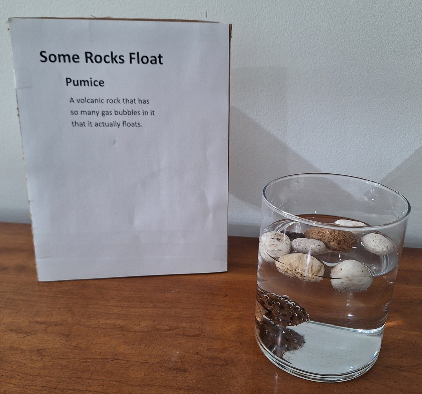 I was talking to some kids, showed them the pumice, and said “Wait a minute.” I ran out, got a small container of water, brought it back, and told them to put the pumice in it, to show them that pumice floats.