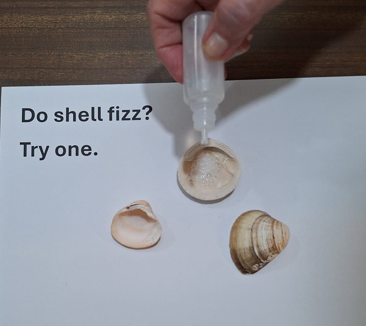 Carbon dioxide is the gas that creates the bubbles in Coke, the same bubbles we see when we drop acid on a rock or shell. The kids love doing this. They could do it all day.