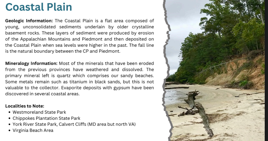 As a convenience for readers, here are enlarged images of the three illustrations embedded in the above slide. Tom spoke about the geology and minerals found within Virginia’s five diverse provinces.