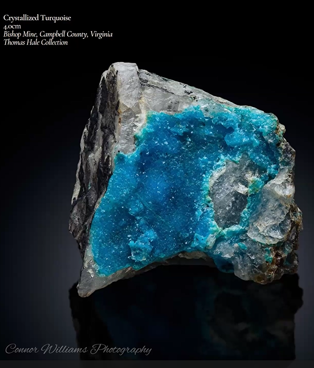 The turquoise specimen below originated in the Bishop Mine. Tom explained that in the early days of mining, this beautiful blue material, discovered in 1910, was mistakenly identified as very rich in copper. But subsequent smelting revealed that this was not the case. Later, the deposit became internationally recognized as a unique site for turquoise.