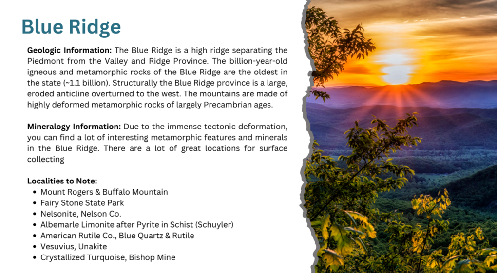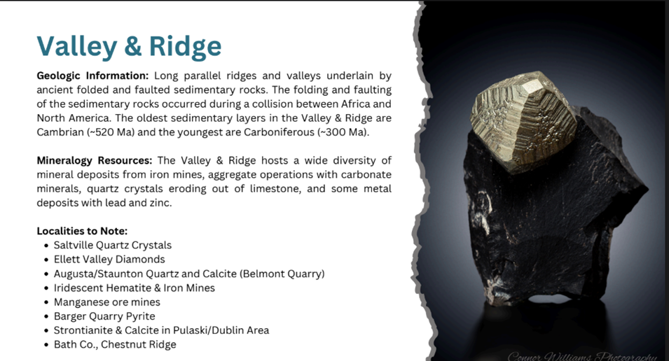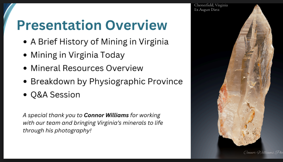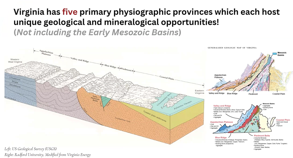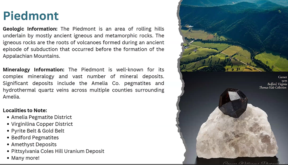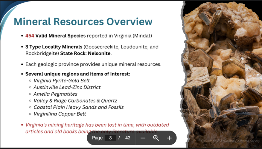 “A lot of tonight is going to be a quick review of Virginia mining history,” followed by a description of the state’s current mining sites and resources. He then focused on identifying the key resources of each of the state’s provinces with many new images of the minerals found across Virginia. For almost all of the amazing images in Tom's presentation, he identified the collecting site and often provided insights into their geologic formation. The following slide highlights the major themes of Tom's presentation.