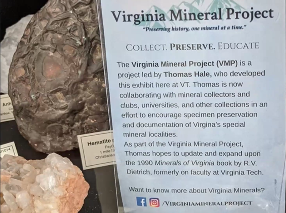 MSDC’s Laura Dwyer, when introducing Tom, reported that as an undergraduate at Virginia Tech, he had contributed diverse mineral specimens to an exhibit on campus. As shown below, a poster described the Virginian Mineral Project whose purpose then and now, has been “to encourage specimen preservation and documentation of Virginia’s special mineral localities.” Tom’s September presentation to MSDC is a continuation of that ongoing effort.