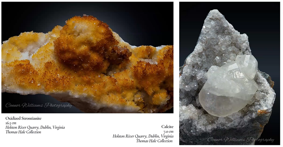 Below are two specimens from Tom’s collection. Throughout his presentation he made many minerals particularly interesting by explaining the process by which they were formed as well as by providing locality information. The golden brown oxidized strontianite (SrCO3) on the left and the calcite (CaCO3) on the right are both from the Holston River Quarry.