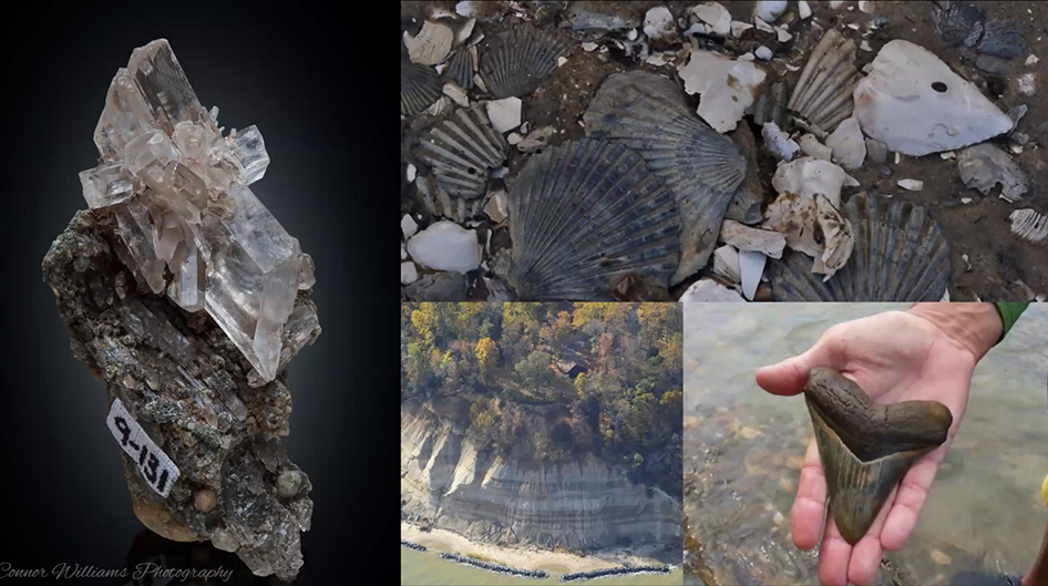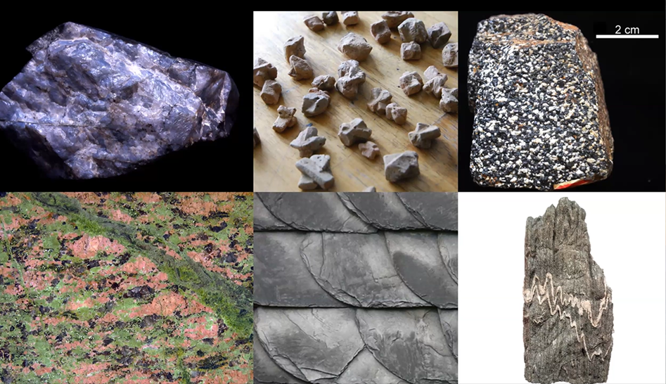 Tom described each of the six specimens below and how they were formed. On the top row are a blue quartz, brown staurolite (x-shaped), and salt and pepper colored nelsonite. The bottom row has the colorful unakite granite on the left with its mix of minerals, black and gray slate, and lastly, the migmatite with its quartz veins that resemble a cardiogram. Go to Tom's video on MSDC’s YouTube channel to learn more about the formation of each of these specimens